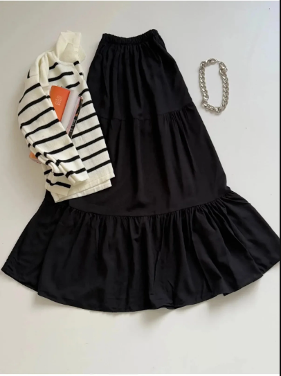 Dokuma viskon kumaş üç katlı etek.Beli lastikli 38-54 beden aralığına uyumlu.Boy 95-100 cm.Yıkama sıcaklığına göre 5% çekme yapabilir.